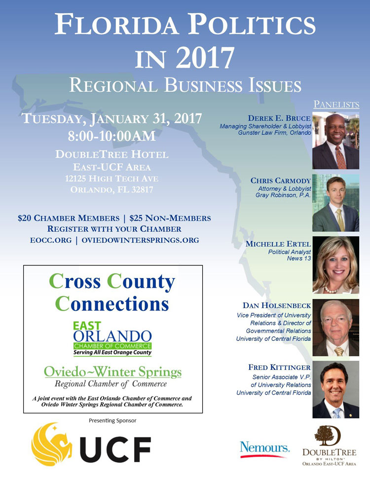 Florida Politics 2017 will be held on Tuesday, Jan. 31, 2017, to discuss regional business issues that affect central Florida companies.