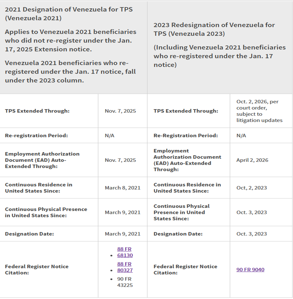 If you re-registered under the previously vacated Jan. 17, 2025 Extension of the 2023 Designation of Venezuela[3], that notice automatically extended through April 2, 2026, the validity of EADs issued under the TPS designation of Venezuela with an original expiration date of Sept. 10, 2025; April 2, 2025; March 10, 2024; or Sept. 9, 2022. If your EAD is covered by this automatic extension, you may continue to use your existing EAD through April 2, 2026, as evidence that you are authorized to work, until further notice.
